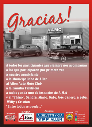 El domingo 15 de septiembre se llevo a cabo 11° Gran Premio de Autos Antiguos, Clásicos y Especiales “Ciudad de Allen”, con la presencia de muchos participantes de distintos clubes del Alto Valle como asi tambien de otras provincias.